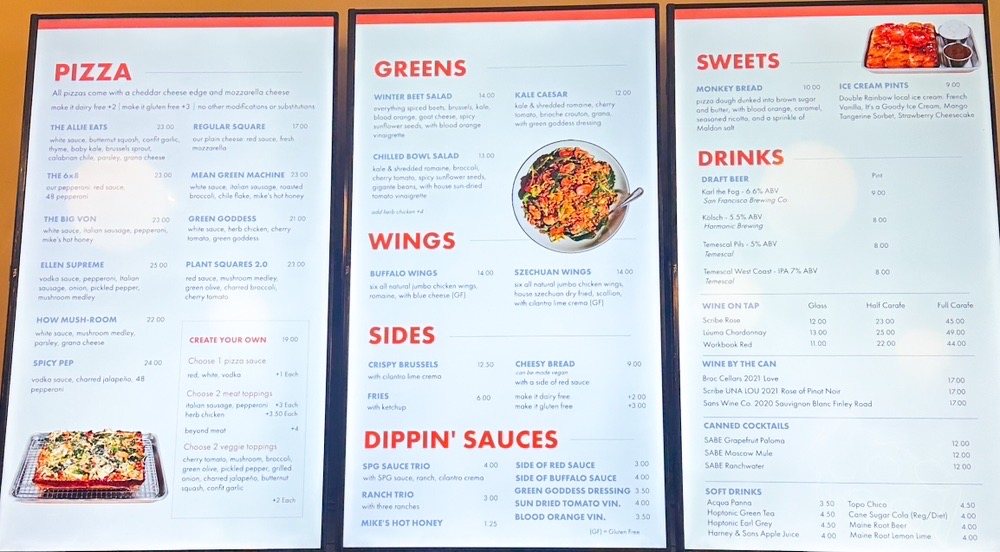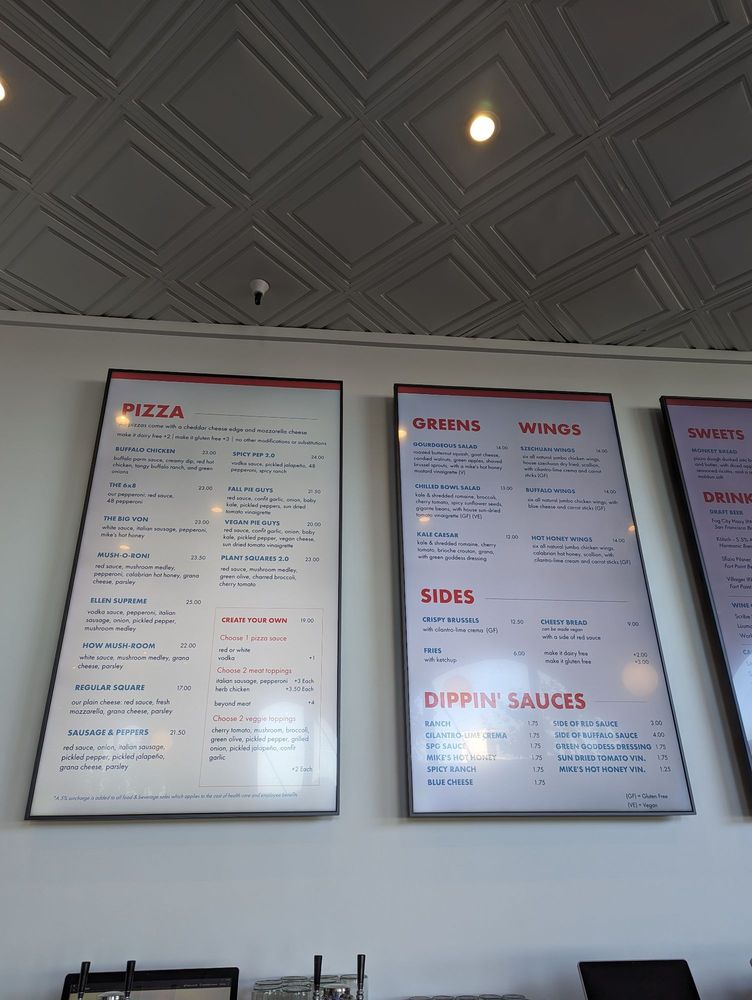 Serves People - Includes regular squares pizzas (w/ red sauce & mozzarella cheese), plant squares pizzas (w/ red sauce, roasted mushrooms, roasted broccoli, cherry tomatoes & olives), x pizzas (w/ red sauce & pepperoni), Big Von pizzas (w/ white sauce, Italian sausage, pepperoni & Mike's hot honey), and How Mush-Room pizzas (w/ white sauce, roasted mushroom medley, parsley & Grana cheese). All pizzas are cut in slices. No substitutions.