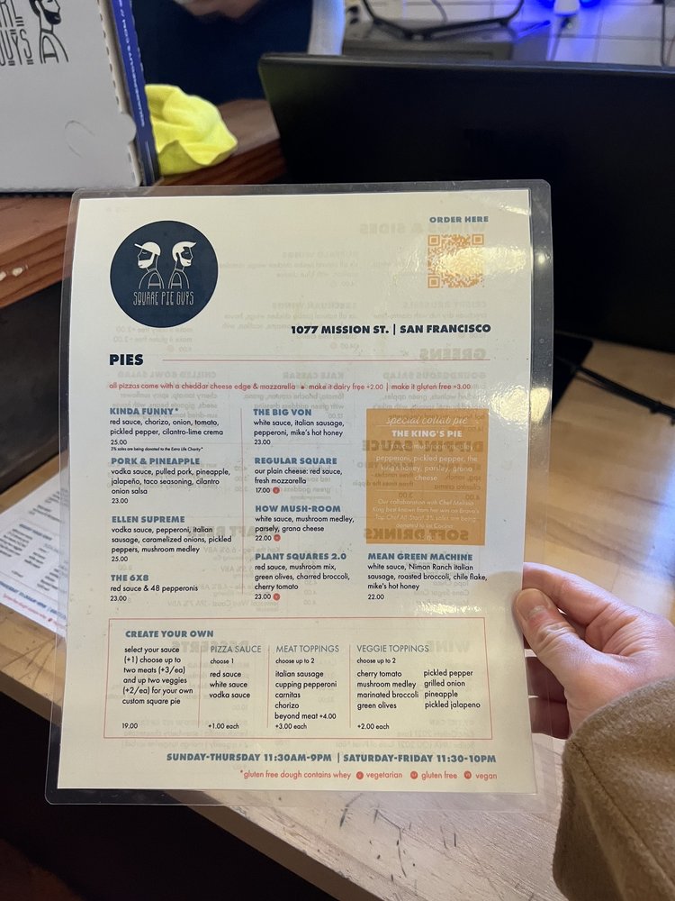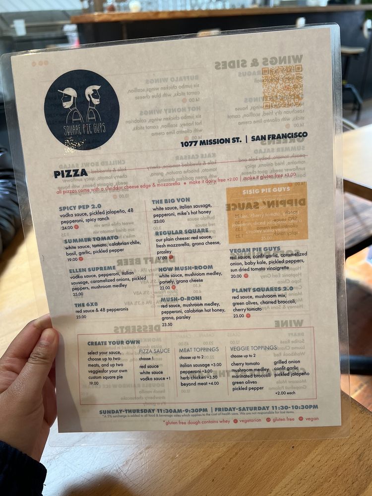 Square Pie Guys offers a unique dining experience in San Francisco, specializing in Detroit-style pizzas, salads, and chicken wings. With a diverse menu that caters to both meat lovers and vegans, Square Pie Guys stands out for their flavorful and delicious offerings. Customers rave about their crispy yet fluffy crusts, innovative toppings like paneer tikka and Szechuan wings, and the creamy vodka sauce on pizzas like Ellen Supreme. The inviting ambiance, friendly staff, and seamless ordering process through QR codes or at the counter make dining at Square Pie Guys a pleasure. Whether you're looking for a gourmet pizza experience or a casual meal with friends, Square Pie Guys delivers on taste, quality, and variety. A must-visit for pizza enthusiasts and foodies alike!